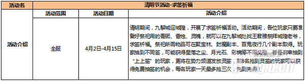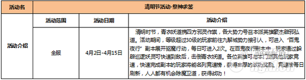 清明期间,九黎城迎城隍,开展了求签祈福活动。活动期间,各位玩家只要准备好祭祀用的青团、香烛、灵魄,就可以在九黎城处找王君雅祭拜城隍老爷,求签祈福。祭祀所需物品可在聚宝林、封魔副本、百鬼夜行几个副本取得。玩家抽到不同签,可能获得星落之尘、月光石、彩锦等不同奖励,若是有幸抽到“上上签”的玩家,更将在势力频道发放灵签,炫耀好运气的同时又能和势力里的朋友们一起互动,前8名抢到灵签的玩家可以获得免费抽签的机会,每名玩家一天最多抢三次,先到先得!
