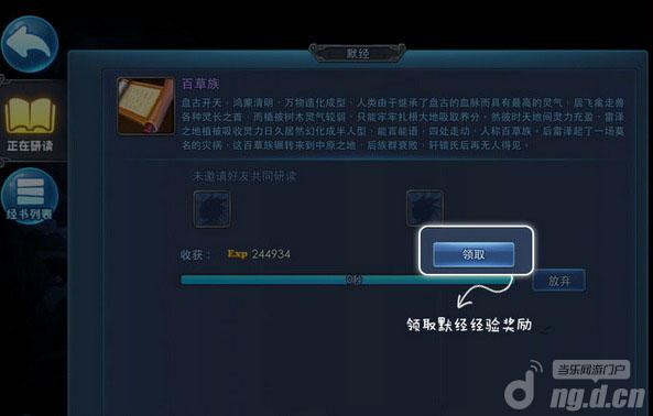 研读完毕后就可以领取全部的经验奖励了,当然了你也可以在中途来领取奖励,每个180秒即可领取一次,你可以分多次领,也可以最后一次领,总经验是一样的。