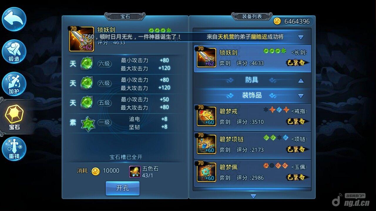 总结:宝石对于平民玩家来说是量变产生质变的关键点,通过合理的配合宝石,我们可以把自己的属性能力提升到最大化。个人推荐弈剑宝石,以70级装备32个宝石来说16天孔+10地孔+6玄孔。