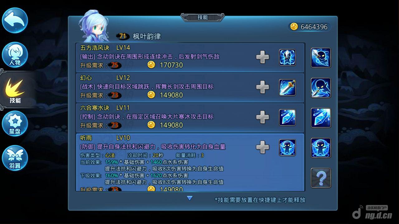 5.听雨:提升法抗和闪避力,吸收8次伤害转换成血量(8次抵挡伤害配合闪避,不多说。神技之一) ★★★★★