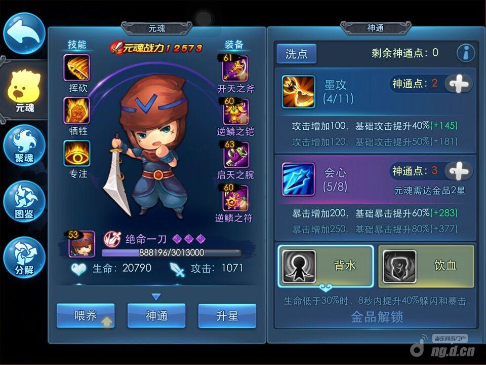 至于小编所说的一肉一辅助二输出,那就是置之死地而后生的招数了,如果你的攻击比对方快比对方强那你就是胜者,一旦攻击力不够那就只有挨揍的命了。肉盾的选择不外乎桃木兵、巨岩兽、冰原熊等,辅助型的元魂一定要选择绝命一刀,因为它不但自身是个暴力型杀手,还能够增加队友的攻击力。最后二个输出,可以选择法系的驭灵师和火麒麟。这样刺激高速的战场,才能让人畅汗淋漓啊。