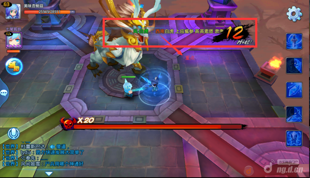 在对势力兽进行了一段时间的厮杀之后注意看屏幕右上角会飘出来一行小字,玄乎的要命根本看不懂是什么意思,蘑菇告诉你们不用看别的,就注意方位名词就好了。图上写了西南,那就果断滚到西南角落里去等待buff,也就是图示左下角。要是写西北那就滚到西北去。方位就是上北下南左西右东这样。根本不用去管什么颜色啊哪个角落是哪个属性啊,这样是不超级简单?
