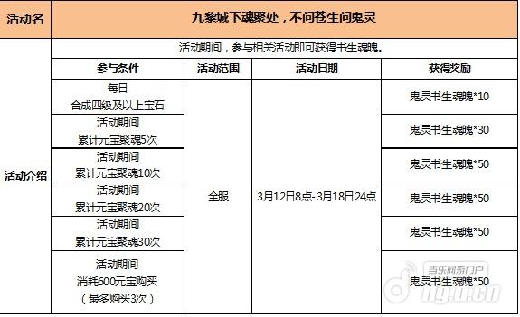 一面匆匆,自从上次鬼灵书生离开锁妖塔后,许多未能一睹其面的英雄们扼腕叹息,现在没有获得书生的玩家们可以不必遗憾了,在3月12日8点-3月18日24点期间,大家可以通过参与宝石合成、聚魂、元宝购买活动来获得一定的书生魂魄。活动细则如下: