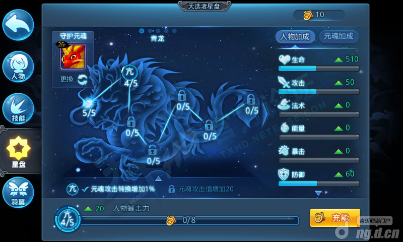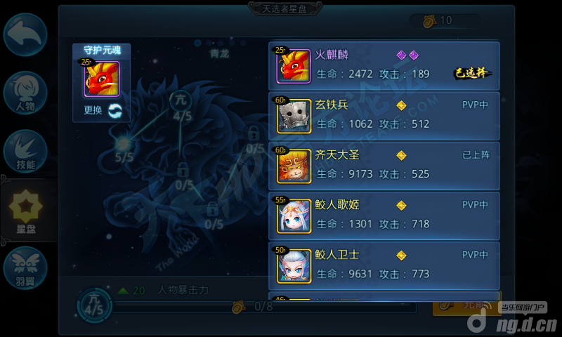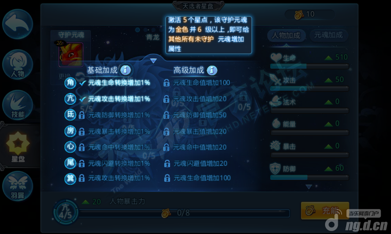 人物达到40级之后,将开放星盘界面,星盘可以设置守护元魂。守护元魂必须是没有上阵的元魂。
