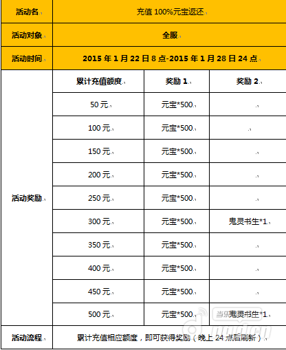 活动内容:玩家只需要在活动时间内充值到相应额度即可获得对应的元宝梯度100%反馈,最高可得5000元宝返还!充值到特定额度更有极品属性紫色新元魂-鬼灵书生赠送。