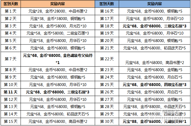 活动内容:活动期间,每次签到都有惊喜,累计签到七天即可获得金色魂装夸父仙符,更多奖励详见附表。