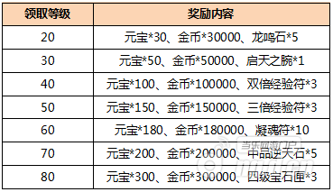 活动内容:活动期间,只要升到20、30、40、50、60、70、80级,都能获得大量的元宝和游戏道具,具体奖励见附表。