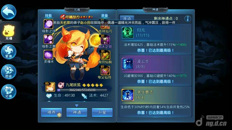 装备:不管金装还是紫装,元魂的装备建议堆血和防御的,狐狸一样要用加闪避的护符,这样会站的更稳