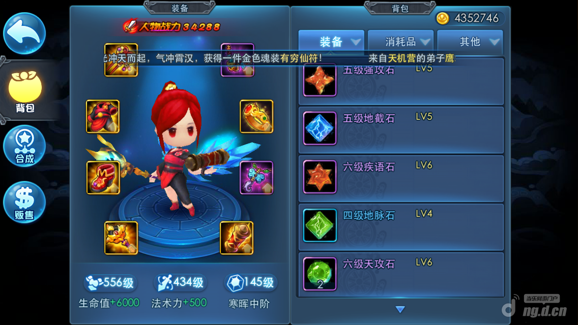 对于装备大家可以多多问问小精灵,小精灵可以为大家列出每件装备的加成方向。至于合成方面推荐大家有多件紫魂装的时候再进行合成。魂装的获取方法主要是魂装袋,每天的杂货铺都要买光(有钱任性)。每天的势力兽别忘记喂养,世界BOSS一定要打。(势力兽吃饱后的要求大家尽量正确的满足它)