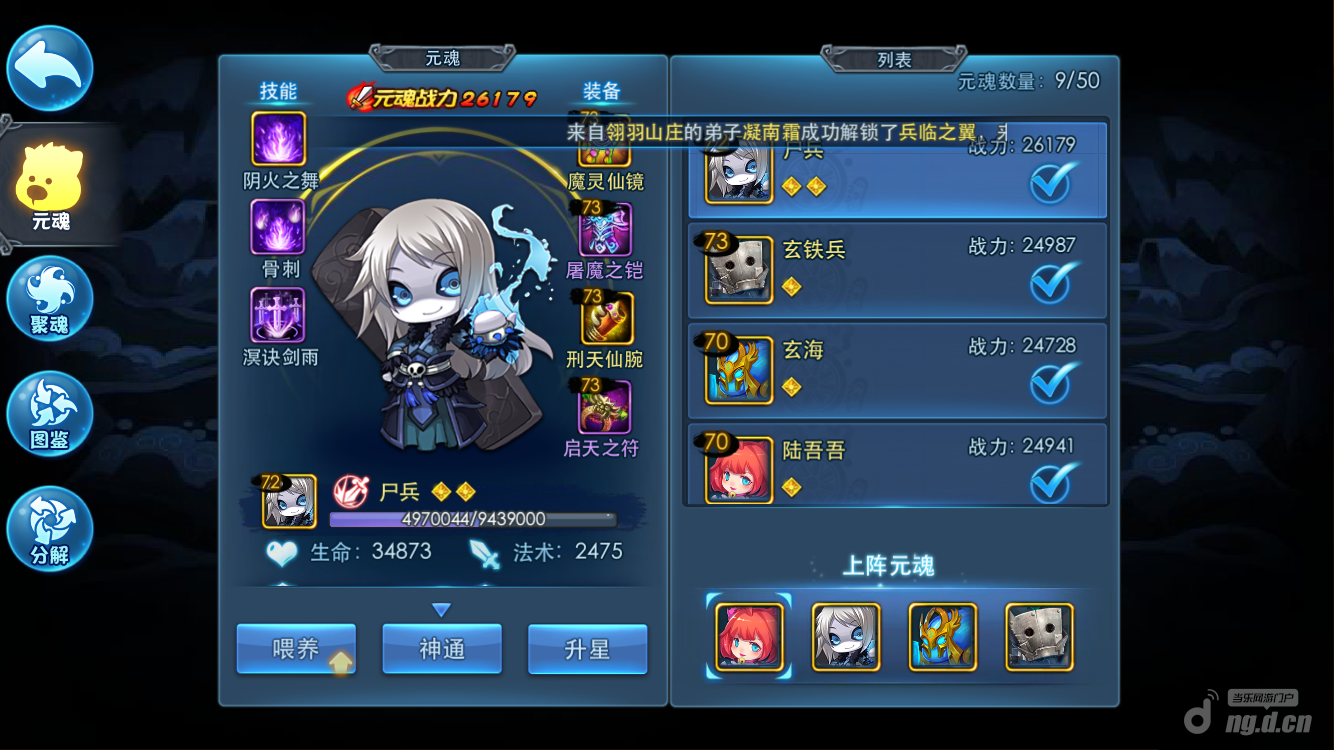 尸兵是另一个最适合羽毛的元魂。这个宝宝能抗能打,是我第一个升金的宝宝。定位是一个很肉的远程,其大招百分比掉血,所以它也具有一定输出。还自带削弱光环,在抗住输出的同时,增加羽毛的输出。尸兵另一个优势是它是远程。可以破坏对面阵型,经常可以看到天机和亦剑追着尸兵打,尸兵边打边跑。