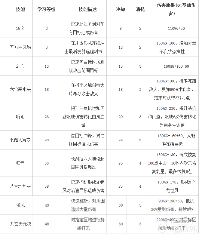 弈剑技能详细数据: