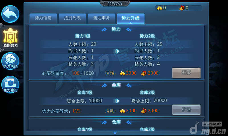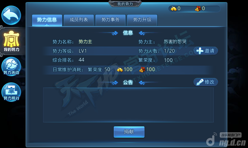 创建势力之后可以查看势力的基本信息,包括势力等级、综合排名、势力人数等等势力信息