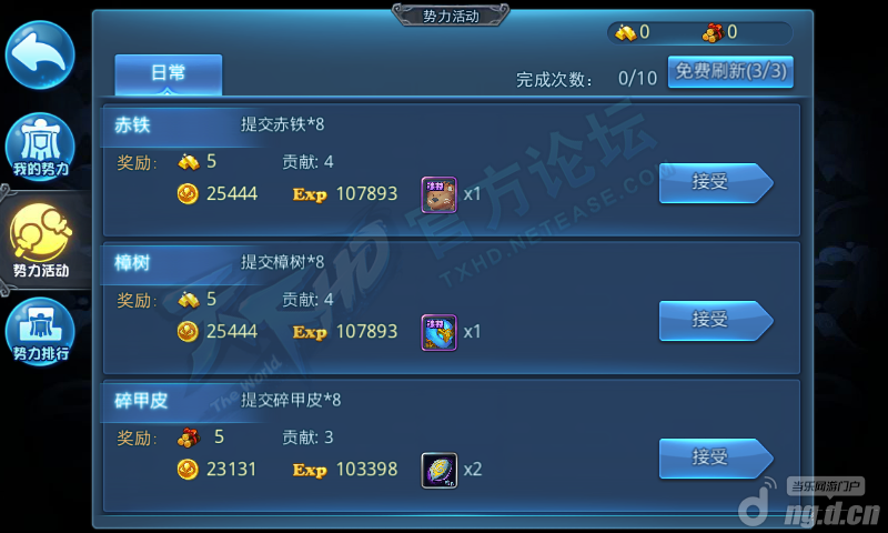 势力中还有势力日常,完成势力日常获得大量经验和势力物资,势力物资用于维护势力以及势力升级