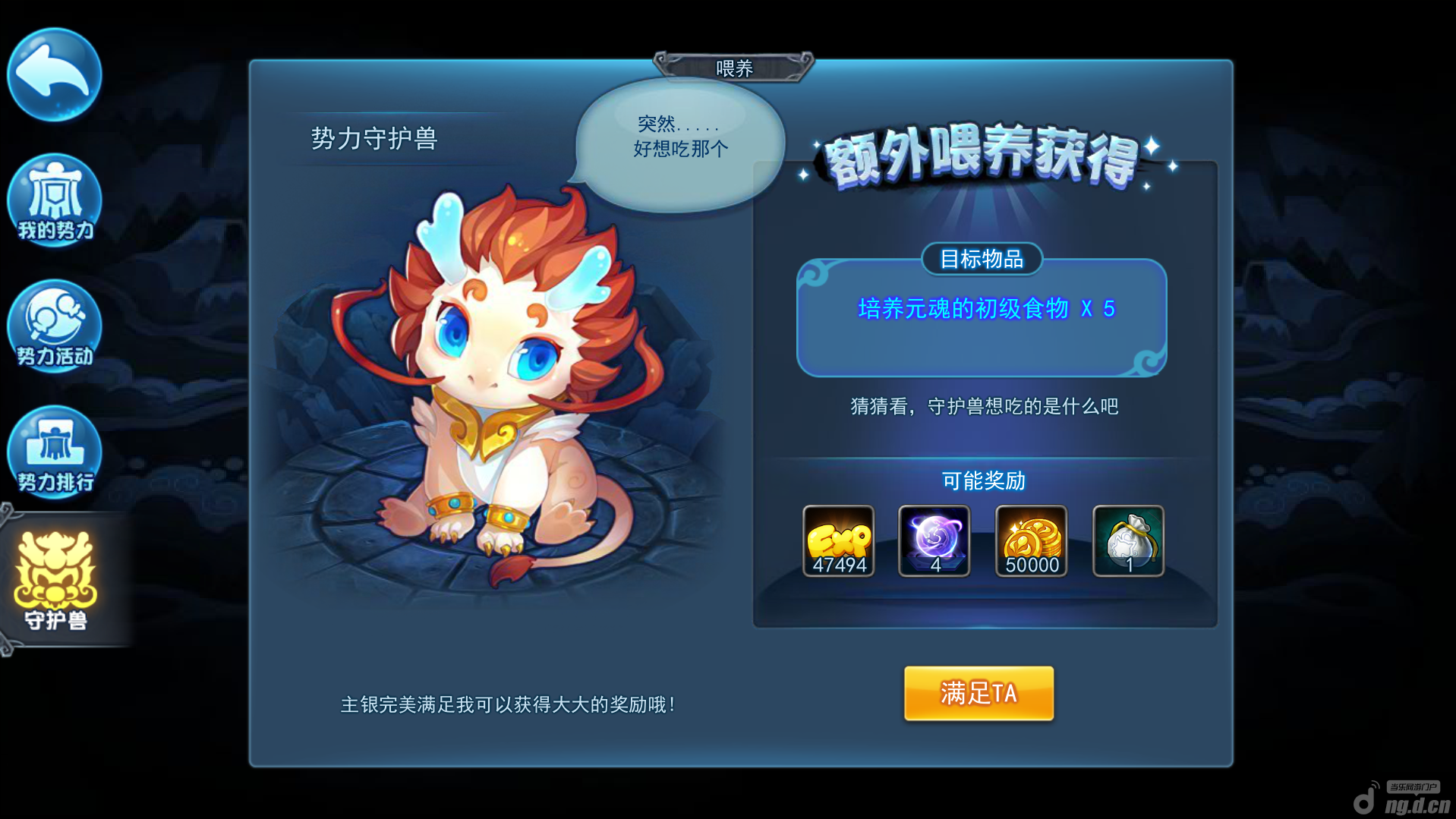 势力兽对好东西可不挑食哦,右边的都是他爱吃的好东西,直到势力兽的喂养度满之后,他会给你丰厚的奖励,另外还有额外奖励哦~