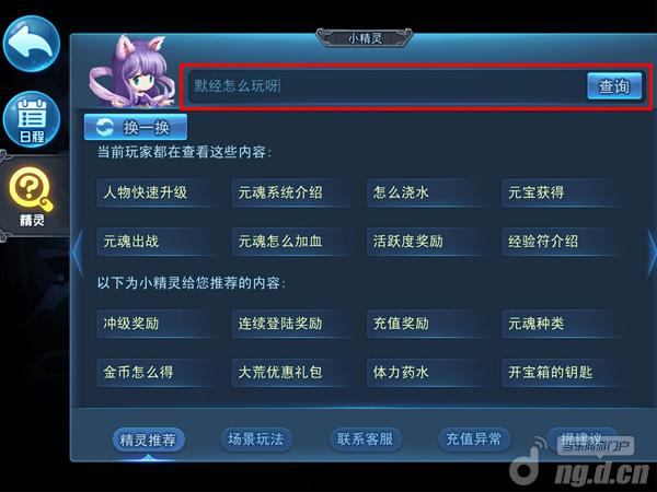 小精灵会将玩家重点关注的问题列出来,让你可以快捷的进行提问哦,你只要点击列表中的问题,就可以得到小精灵的回复啦。 当然啦你也可以自主询问哦,在上方的输入框中输入你要问的问题即可,如下图: