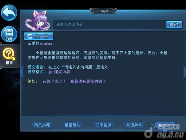 小精灵不但承包了回答问题的重任,还会收集玩家的建议哟,你只要按照格式将建议发送给她,就会自动记录下来啦。