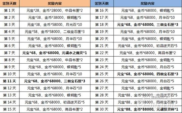 活动内容:活动期间,每次签到都有惊喜,累计签到七天即可获得紫色元魂【水之魔灵】,更多奖励详见附表。