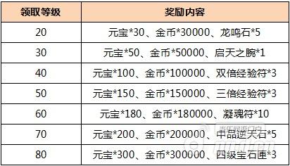 活动内容:活动期间,只要升到20、30、40、50、60、70、80级,都能获得大量的元宝和游戏道具,具体奖励见附表。