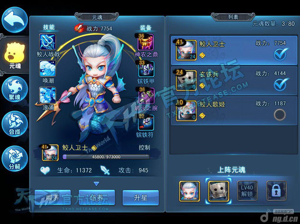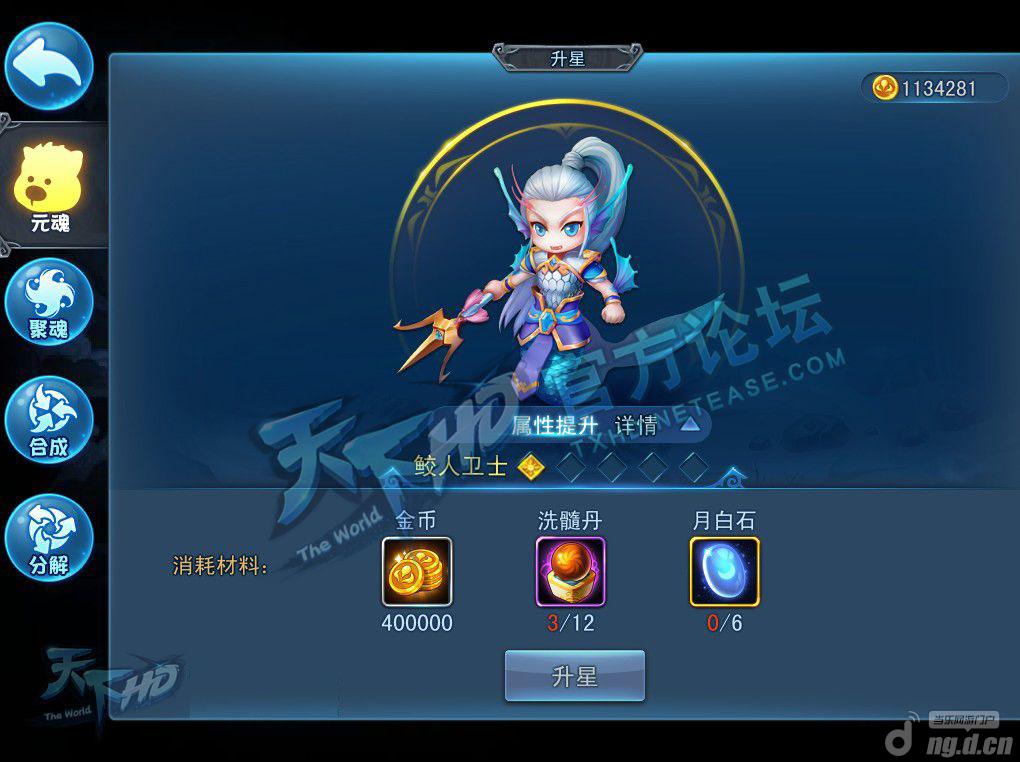 4.升星:达到一定等级时在这里可以使用同种元魂作为材料进化元魂,使元魂的品质上升;