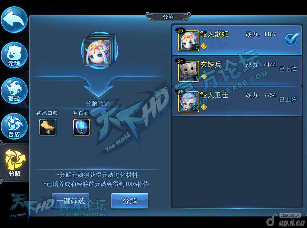 分解:没用的元魂我们怎么处理呢?我们就可以用它们来分解,从而获得魂丹,而元魂被分解后是会消散的,要注意别把有用的元魂残忍的炼掉哦,已经培养过的或有经验的元魂分解后是可以得到100%补偿(魂丹和口粮)。