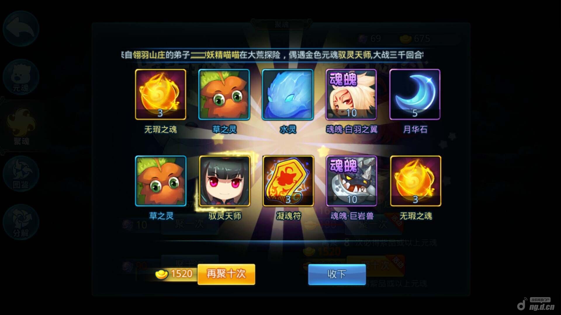 小编现在的装备基本都是6级宝石,所以留下来的元宝都用了元魂上。如果你想抽元魂,建议直接10连吧。小编抽过一个金色的驭灵天师,也有玩家说3W元宝没见过一个金色的。只能说几率这个东西你懂的。但是其他渠道获取的元魂速度还是太慢,所以元宝充裕的友友们,抽抽元魂还是可以的。