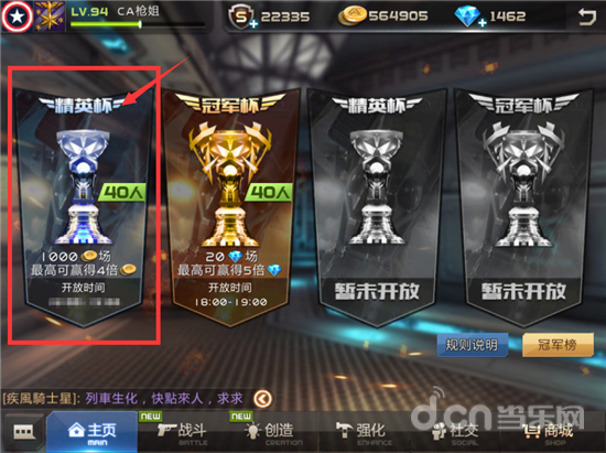 报名后,在活动时间内,点击游戏首页“战斗”按钮,进入战斗页面点击“冠军杯赛”中金币报名的“精英杯(40人)”参与比赛。
