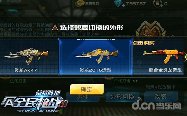 在“荣耀阵地”版本中,玩家可自由更换购买的传奇武器的造型。免费赠送给全体玩家炎龙全新造型,只要玩家拥有炎龙AK47,就可将其更换造型。我的枪战,我的炎龙,就是和你们不一样!