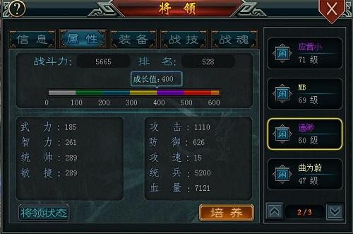 2、成长值:将领因为成长值的不同,会有不同的颜色星级表现,也将对将领战力带来影响!