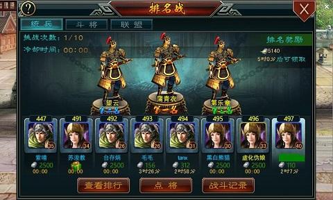 排名战是证明自己实力的好地方,排名战已开放统兵战和斗将战两种模式。玩家之间可以进行相互PK挑战,从而提高自己在排行榜上的排名名次。排名越前,可获得的奖励就越好,礼金,白银,排名宝箱,等你来抢!