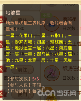 地煞星,和端游一样需要1级1级杀上去,每天杀5次(1星花果山,2星五指山,3星修罗古城,4星蟠桃园,5星地狱迷宫1,6星海底迷宫1,7星御马监,8星瑶池,9星龙1,10星凤1)每次杀完都可以获得奖励和经验,正常6星开始是难度本有3个NPC比较猛,我现在每天都在杀5星然后星的位置打开活动点地煞星会告诉你星的位置在哪个图