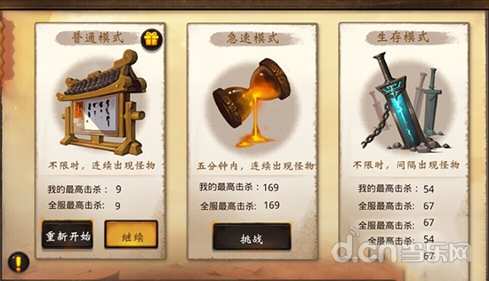 生存模式—每一段时间出怪,这个要根据输出,杀得越快越好,不然怪一直出,会被怪淹没,奖励同上