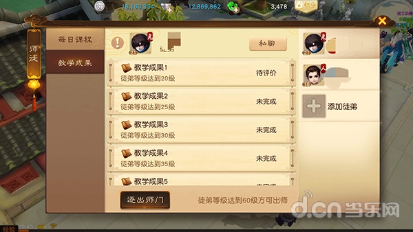 拜师成功后,徒弟立即获得“XX之徒”的称谓。师徒关系存续期间,师傅每天可以发布“师徒任务”,任务每天凌晨5点刷新。师徒组队完成师徒任务后,双方即可获得各自的物品奖励,且徒弟还能获得经验,师傅则能获得师徒积分。师徒积分可用于商城兑换物品奖励。当徒弟达成阶段性教学成果后,可对师傅进行评价,评价结果将影响师傅可获得师徒积分的数量。