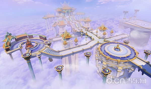 云腾雾绕,霞光隐隐,碧沉沉琉璃造就,明幌幌宝玉妆成,天宫场景主要由金碧辉煌的琉璃瓦和洁净无瑕的汉白玉步道构成。老君丹炉悬空而立,远处高台上金色的铁链交错,似乎是锁妖行刑之处。飞檐斗拱的楼阁左右穿插,云雾之间拾阶而上是堂皇庄严的凌霄宝殿。华贵中不失化外之感,果然是天宫气象。