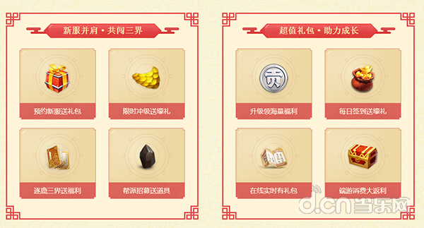 开服14天时,“限时冲级送壕礼”将为所有达到60级的少侠,送上一份包含龙鳞、高九彩云龙珠等豪华奖励。更有“逐鹿三界计划”会结算战力总榜排名,位列榜首的少侠,将勇得“逐鹿三界”桂冠,并收获内含终极技能书等稀有道具的“威震三界”大礼包,而随后排名的少侠,也有“笑看江湖”、“技惊四座”、“阳光普照”等礼包可以赢取。此外,“帮派招募”也将在帮派分别达到75人、90人时送出礼包,让你和帮派兄弟并肩共闯三界。