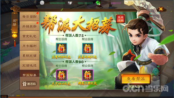 此外通过“帮派大招募”活动,所在帮派达到一定人数时,帮主帮众都获得丰厚奖励。每位少侠在终极封测中都有机会领取75人帮派奖励与90人帮派奖励各一次。帮派人数达到75人,帮众可获得“众志成城”礼包,帮主获得“众望所归”礼包一份;达到90人,帮众可获得“群英聚会”礼包,帮主获得“天下归心”礼包。礼包中有大量师贡,以及东海之水、迷谷之花、宝石、鉴定符、龙鳞、技能书等材料和物品奖励。帮派兄弟果然是三界之行的最强助力!