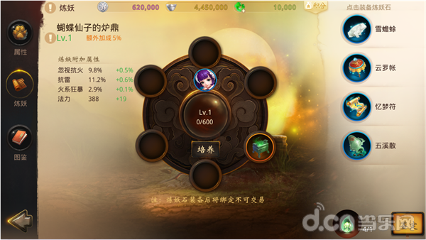 玩法中有机会获得炼妖原石,通过“鉴定”可以随机获得不同的炼妖石,装备后可以大大提升召唤兽的能力。不需要的炼妖石可以交易或者喂养炉鼎,炉鼎会对炼妖石等比例加成