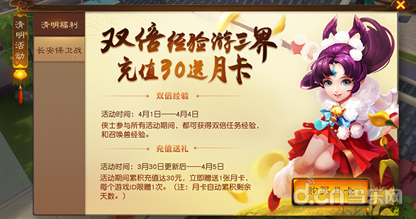为了迎接即将开启的首部资料片,热血版福利再次升级。即日起至4月5日,只要累计充值达30元,就立即赠送一张月卡,让各位少侠获得丰厚的经验、宝石奖励,三界之旅更加轻松。此外4月1日至4月4日还将开启全民双倍经验,让大家畅爽升级乐翻天。