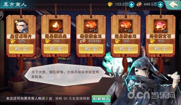 3. 若黑市商人携带物品不合少侠心意,可以通过消耗元宝刷新。