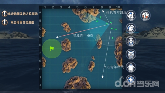 沙窝争霸,这个图很直观,没什么障碍物,潜艇的两(san)种路线已经标注在图上了。大神开局直冲对方老窝一挑多,普通青年走占旗路线。其实我个人更推荐占旗路线,更加稳妥。走大神路线,一旦碰到对方驱逐舰和你对峙并大放水雷,就会很棘手。