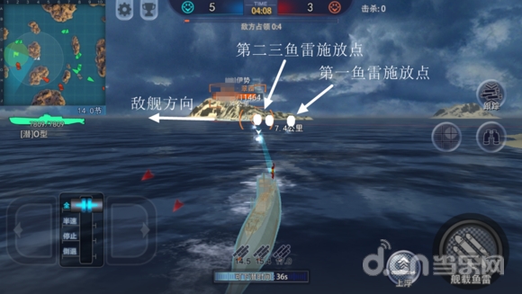 下面下潜,并开始主要攻击了,对方船是战列舰,而且是单独出现,此类条件是潜艇攻击的最佳条件。攻击前首先判断对方行驶方向,然后微调潜艇头部使得敌船进入攻击范围。鱼雷分两组发射,发射线对准敌舰船头往前一点的位置先发射一枚,判断敌舰与鱼雷的相对速度,再发射地二组的两枚鱼雷,如果对方是速度较慢的战列舰,这两枚鱼雷相隔距离要稍短一些,如果是速度较快的驱逐舰,则需要考虑其转圈的问题,左右各发射一枚鱼雷,以防其杀回马枪。当然,对方玩家玩法不同,具体的情况还需具体讨论。回到图中,由于第一枚鱼雷没有击中对方船尾,所以第二组鱼雷要和第一枚鱼雷拉开距离,连续释放。